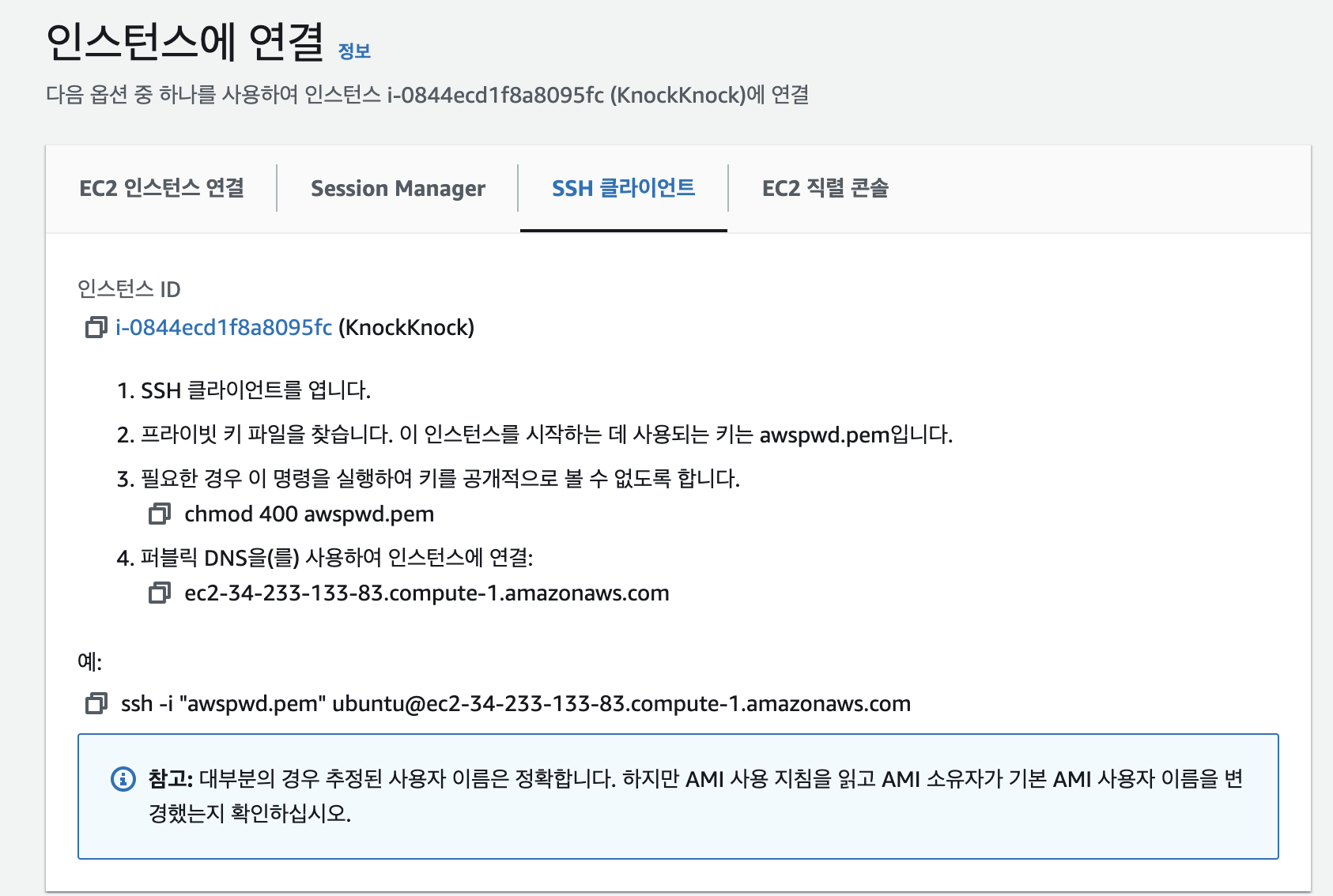 ssh -i {키파일 이름.pem} ubuntu@ {퍼블릭 DNS 주소}