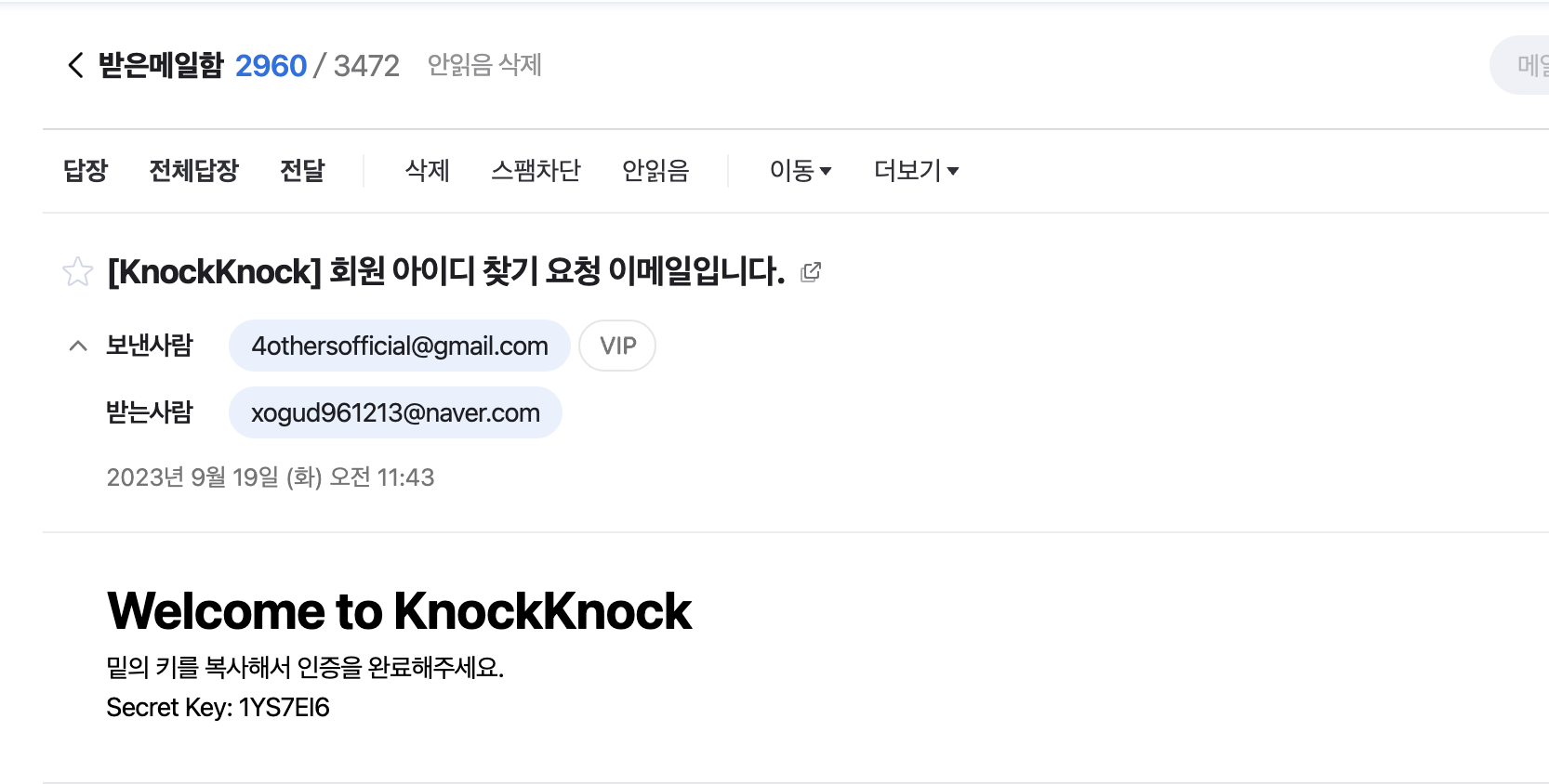 <title>[KnockKnock] 회원님의 아이디 찾기를 위한 인증번호입니다.</title>