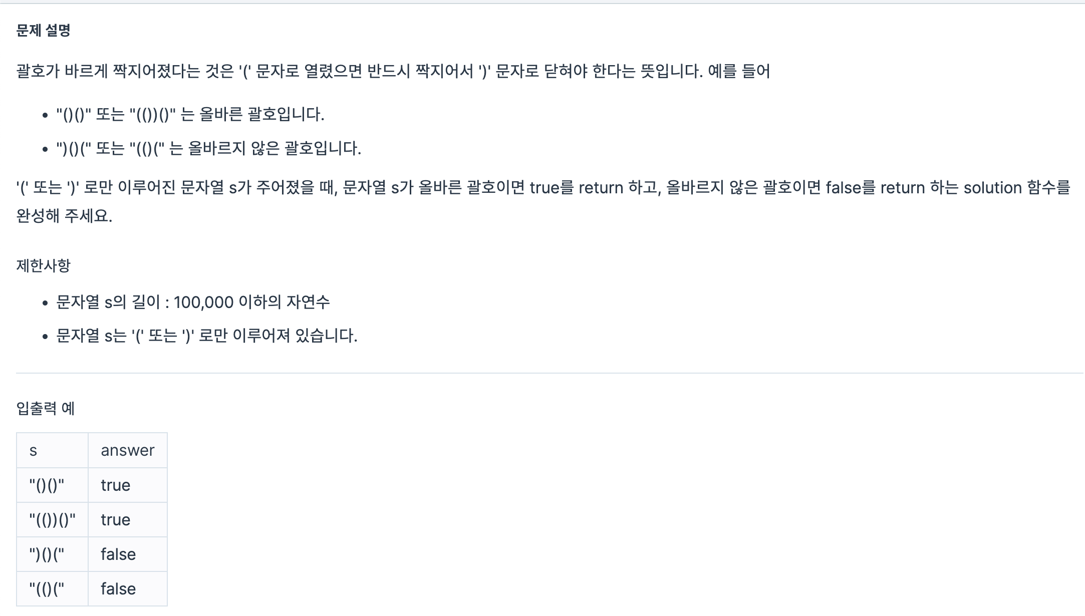 조건4. 앞에서부터 차례로 볼때, ( 하면 cnt ++, ) 하면 cnt--, 그런데 cnt가 마이너스가 되는경우엔 false.(닫는괄호가 더많이 나왔다는 뜻)