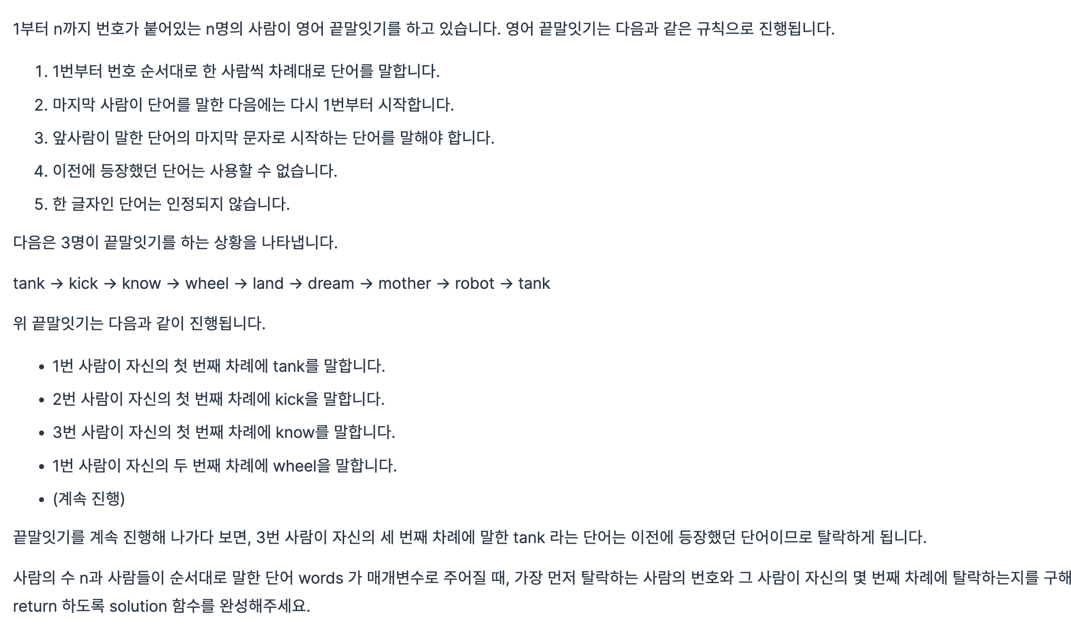 public int[] solution(int n, String[] words) {