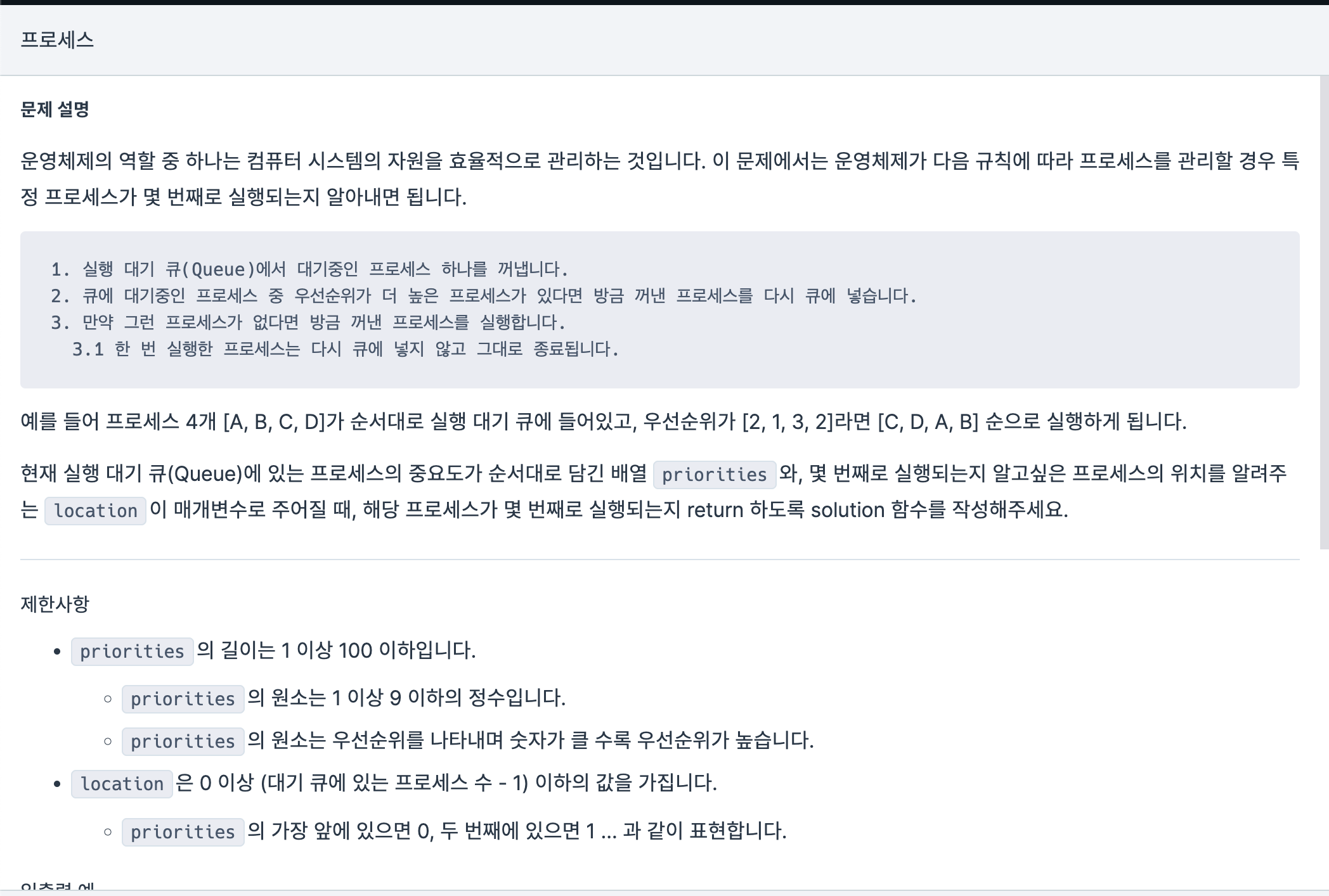오늘도 큐를 쓰는게 훨씬 편할거같아서 한번 써봤다. ㅇ 1트 public static int solution(int[] priorities, int location) { int answer = 0; //빈 큐를 하나 만들고 거기에 priorities 넣음 Queue q = new LinkedList(); for(int i = 0