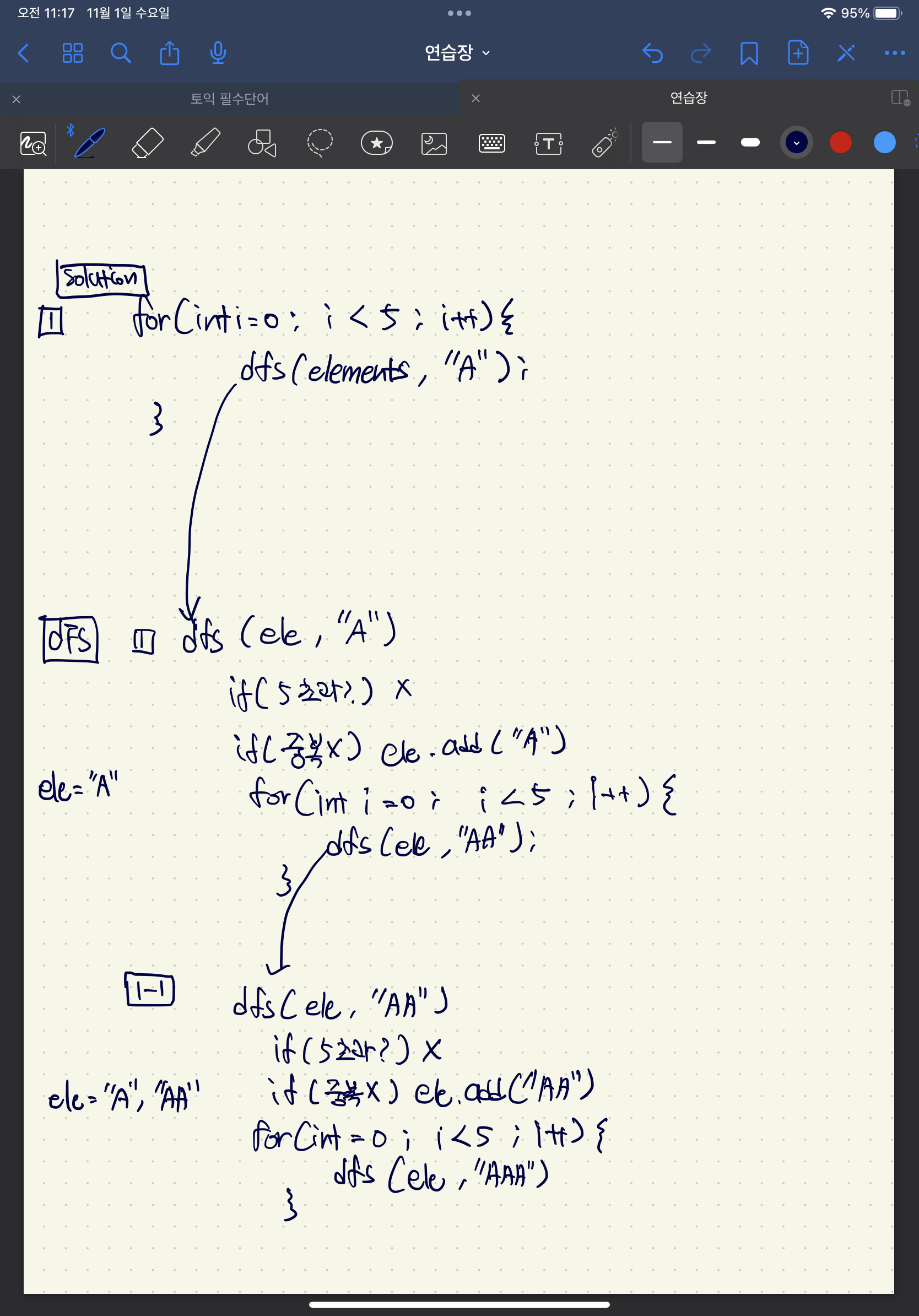 코드를 보며 dfs메서드가 재귀되면서 어떻게 되는지를 그려가며 해봤다. 그려보니 이제서야 이해가 갔다. 근데 도저히 내머리로는 이걸 코드로 짜는게 안될거같긴하지만 익숙해지려 노력해보면 언젠가 될거라 믿는다...!