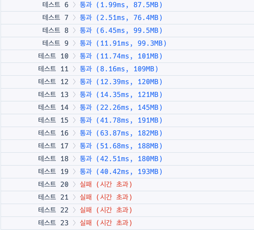 그럼 그렇지...테스트케이스는 통과되지만, 시간복잡도가 높아서 통과되지 않았다. 그래서 스택으로 다시 풀었다.
