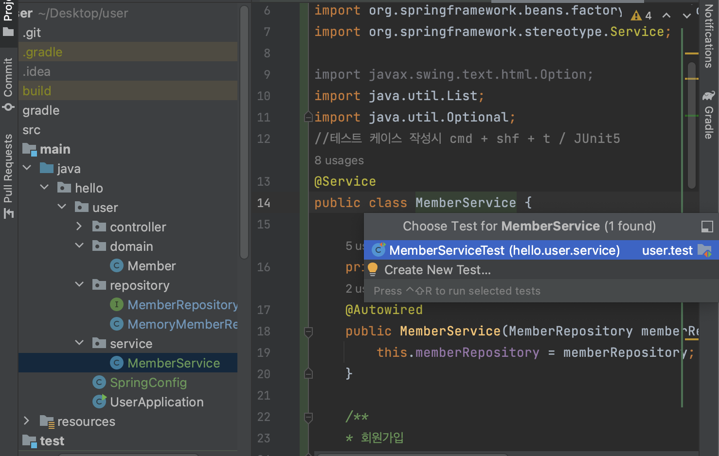 비지니스 로직인 서비스코드. 회원가입 로직인 join 메서드를 보면 중복회원이 없도록 예외처리를 해놨는데, 예외처리를 저렇게 validateDuplicateMember() 메서드로 따로 빼서 사용하는데 저렇게 하려면 cmd + t 를 누르면 메서드로 따로 빠진다. 정말 유용한 단축키다.