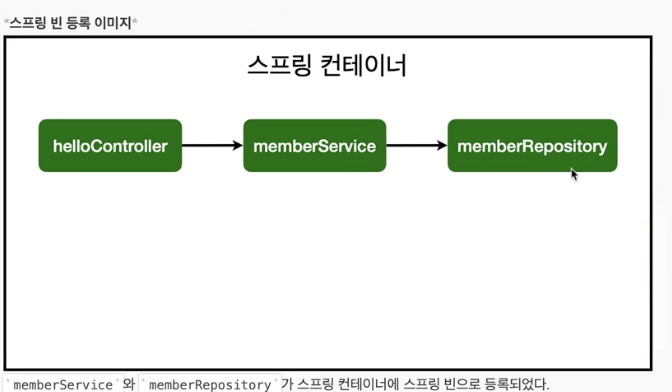 다양한 컨트롤러에서 memberService를 받아쓸것이다. 다시말해, 하나만 생성해서 공용으로 쓰면된다.