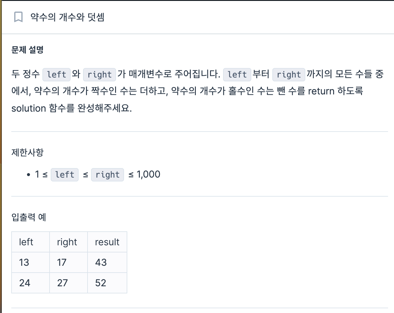 처음에 헷갈렸던 부분이 cnt++ 해주고 i가 바뀔때마다 cnt를 0으로 초기화해주는걸 깜빡했다. cnt를 0으로 초기화해줘야 각수의 약수가 짝수인지 홀수인지 알 수 있다.