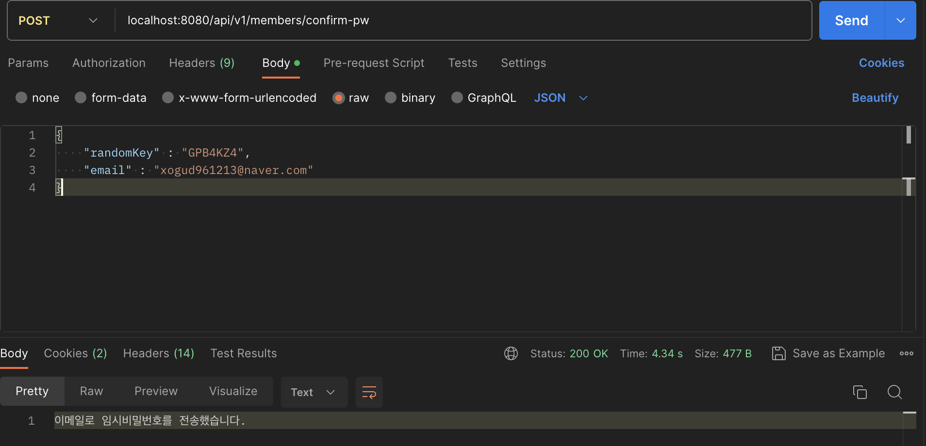 return ResponseEntity.ok("이메일로 임시비밀번호를 전송했습니다.");