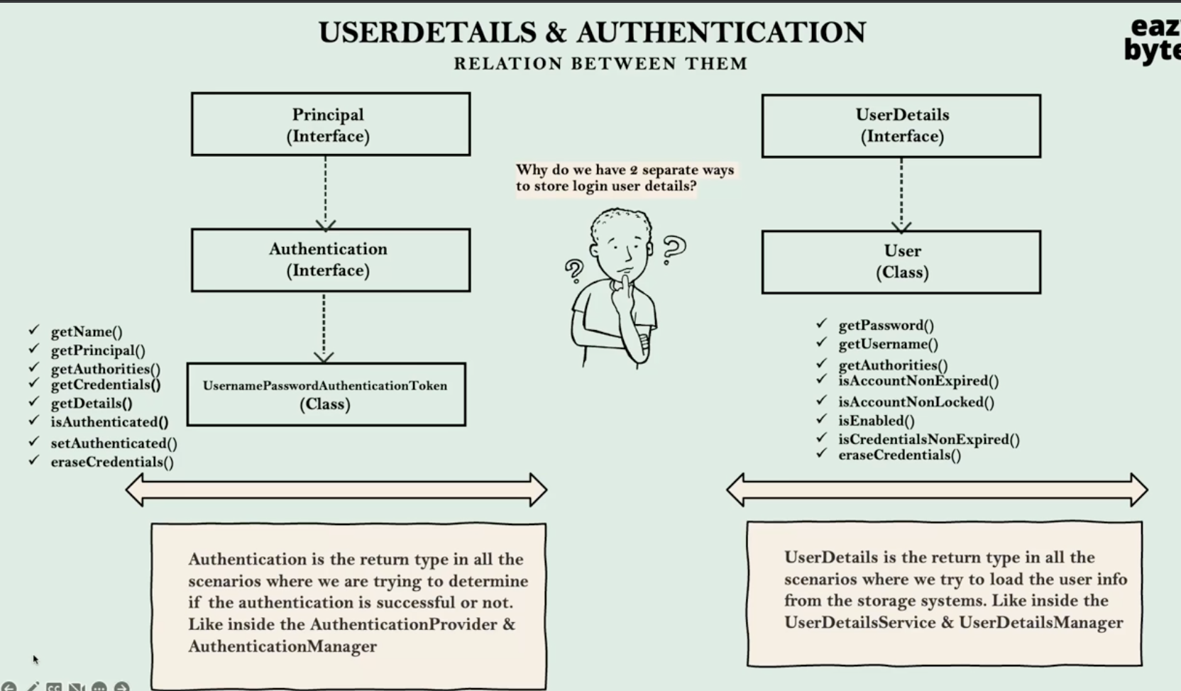 UserDetails,User 에는 getter메서드만존재하고 setter메서드는 존재하지 않다. 읽기만 가능하다는뜻.