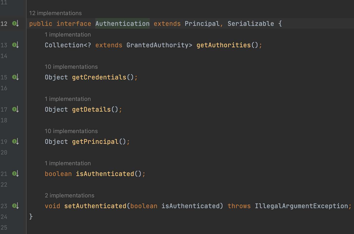 가장위에있는 인터페이스는 UserDetailsService다. 여기엔 위에서 썼던 loadUserByUsername이란 추상메서드가 존재한다.