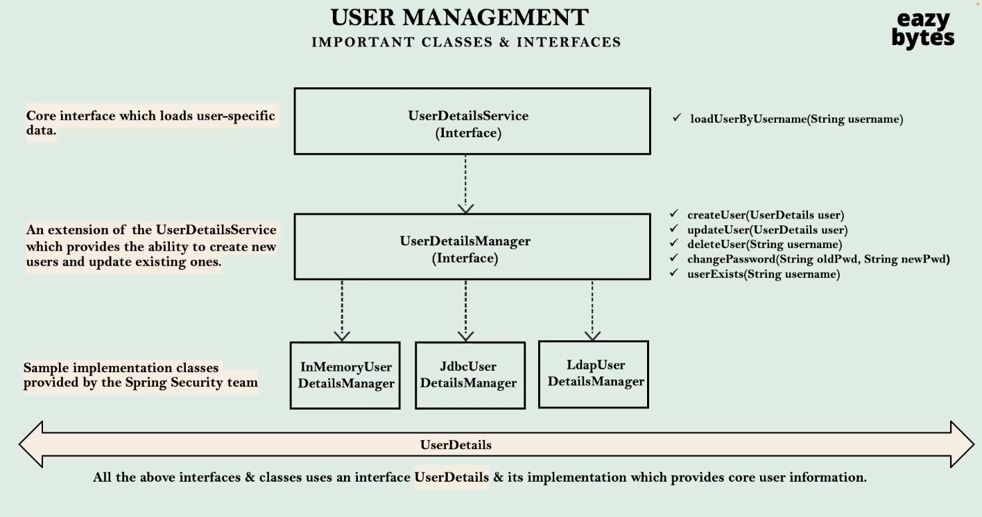 이 UserDetailsManager를 디테일하게 구현한 InMemoryUserDeatilsManager, JdbcUserDetailsManager 등이 있다.