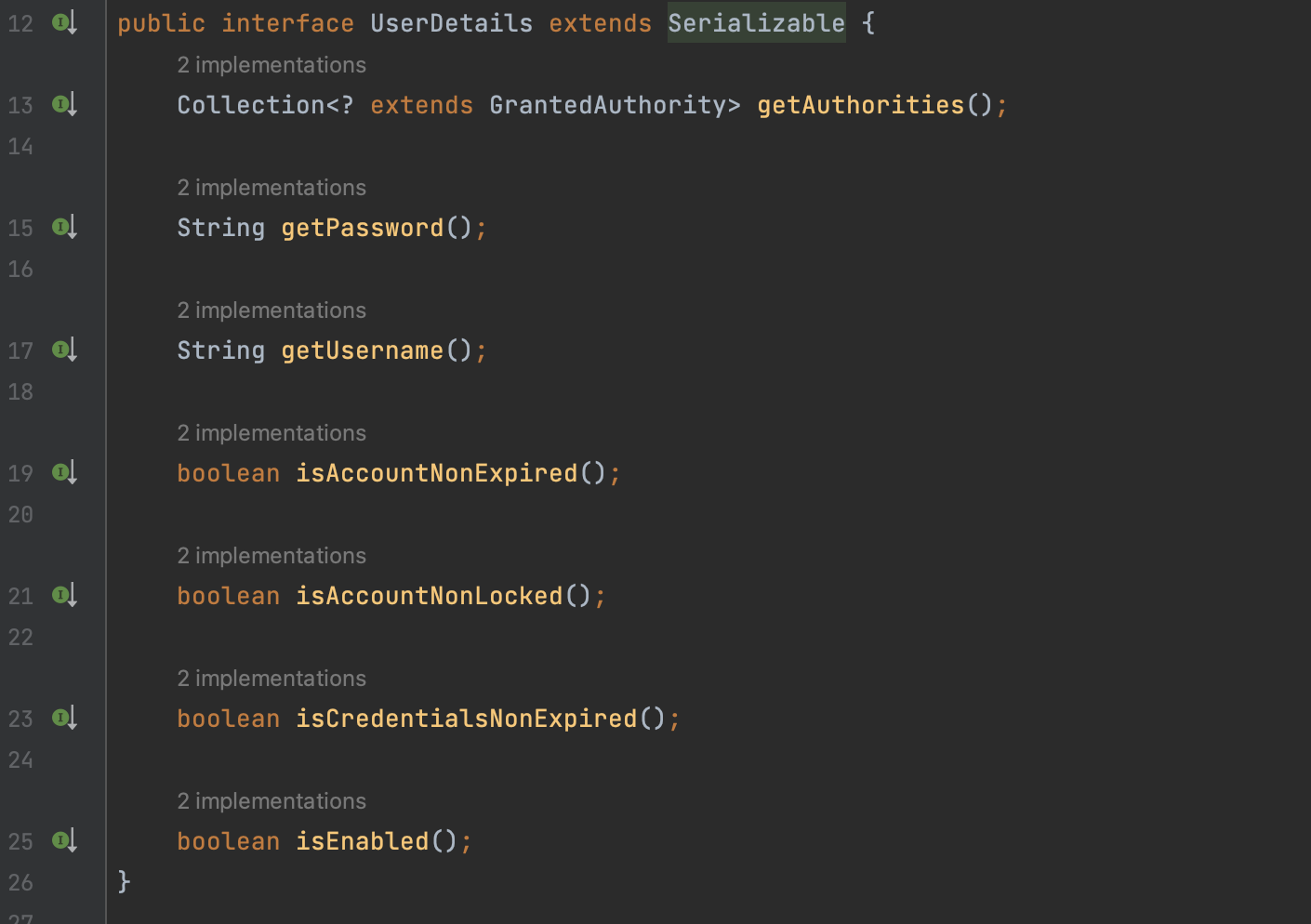 UserDetails는 이런 추상메서드들을 포함하고있다. SpringSecurity팀은 샘플코드를 제공해준다.