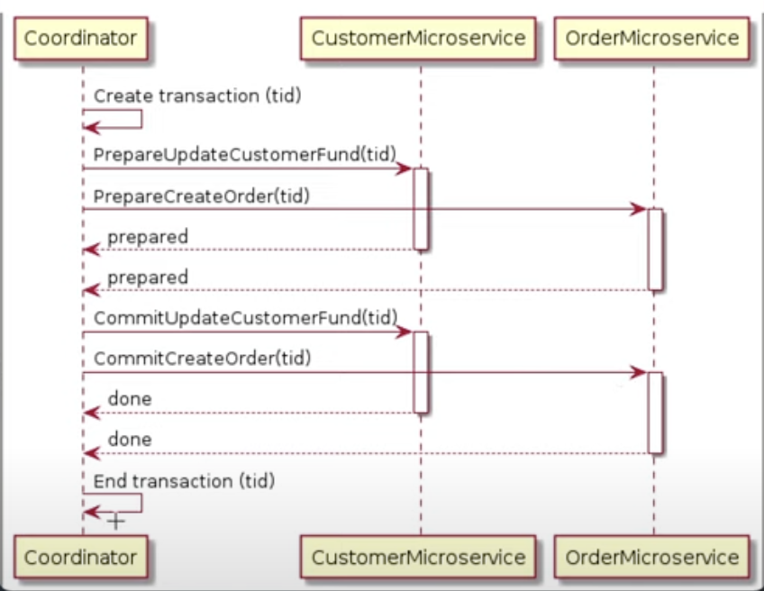 Participants(참여자) : 트랜잭션의 일부를 처리하는 노드로, 각 참여자들은 조정자의 명령에 따라 트랜잭션을 처리한다.
