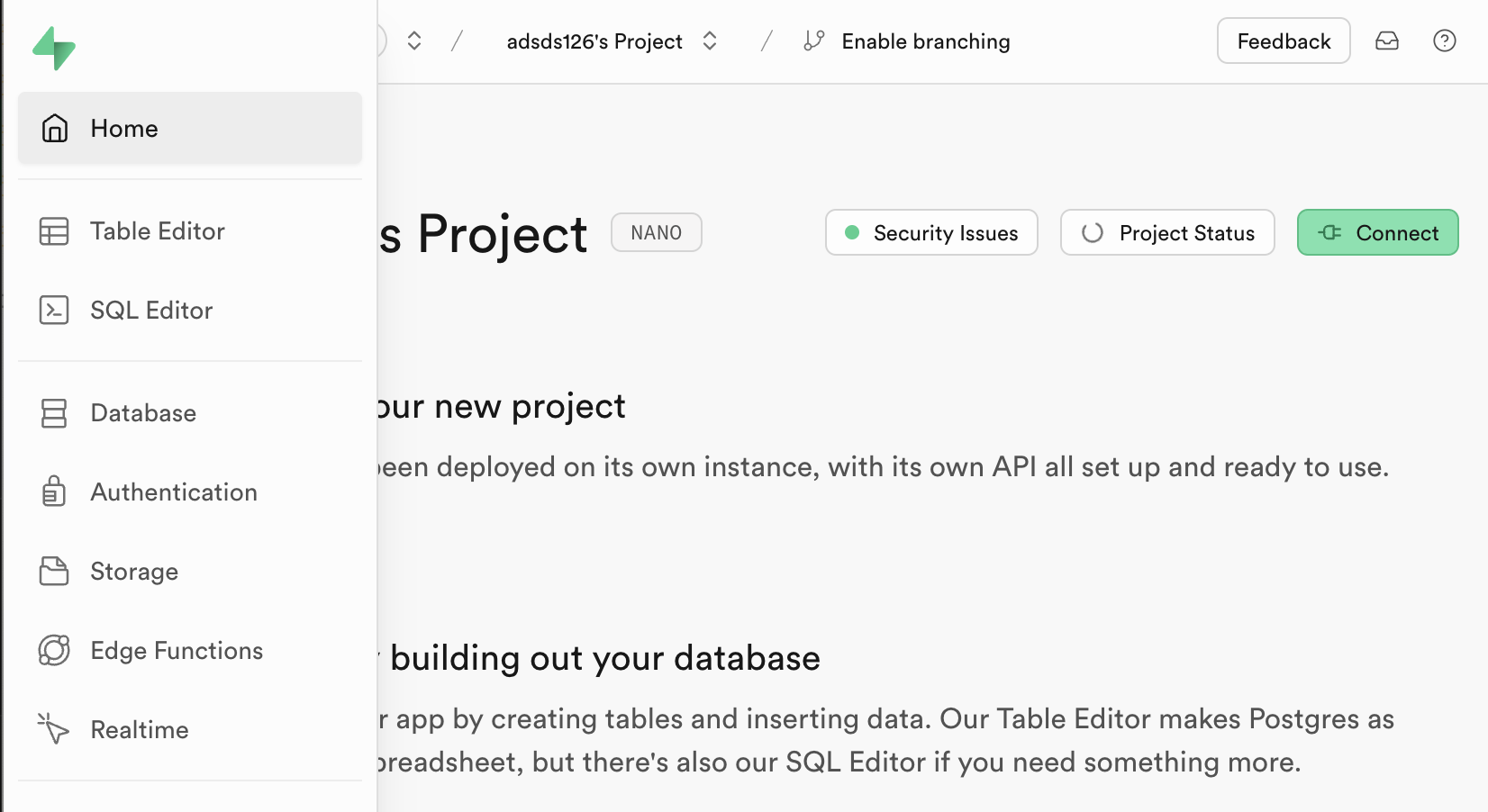 supabase.com에 들어가서 회원가입을 하고, org을 만들고 project까지 만들면 옆에 메뉴에 위에서 밑줄친 부분에서 언급했던, DB, 인증, 스토리지, 엣지펑션 메뉴가 있다.