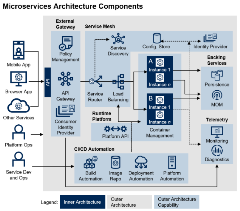 클라이언트들의 요청은 api gateway라는 접속점을 통해서 서비스 라우터에게 어디로 가야할지 물어보고 필요한 마이크로 서비스가 어디에 저장되어있는지 서비스 디스커버리의 등록 서비스에 물어보게되고 알게되면 서비스로 이동하게 된다. 분산되어있으면 로드 밸런서를 통해 접근하게 된다. 완성된 어플리케이션은 배포를 위해 CI/CD기술을 사용한다. Backing services는 마이크로 서비스에 저장되어 이쓴 다양한 스토리지들을 모아서 사용할 수 있는 방법들이다. MOM(메시징 시스템)을 통해서 하나의 서비스와 다른 서비스를 같이 연결할 수도 있다. Telemetry 는 마이크로 서비스의 모니터링 기능, 진단 기능을 가지고 있다.