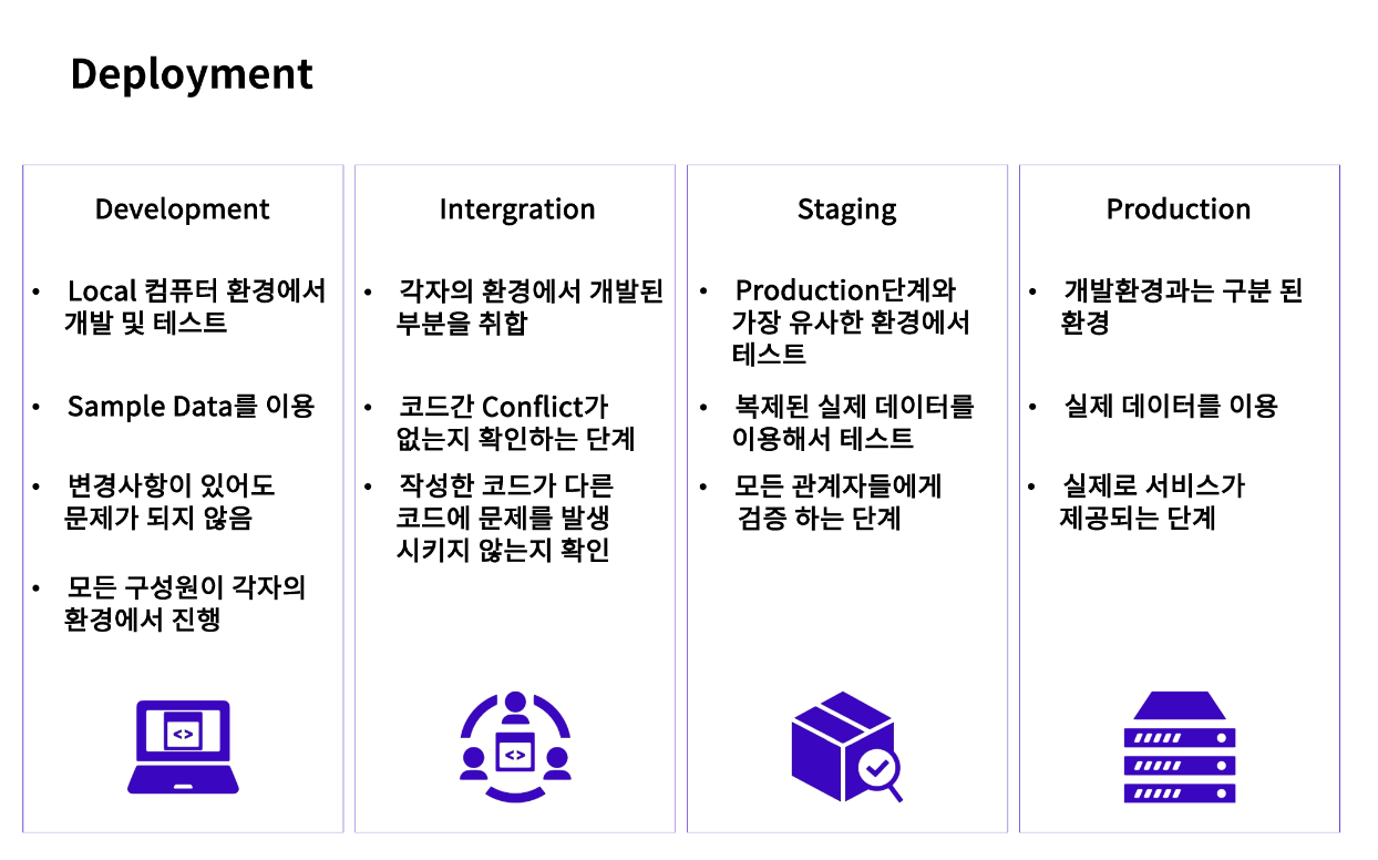 Production - 개발된 서비스를 출시하는 단계. 사용자가 접속할 수 있는 Production 환경에서 코드를 구동하고 서비스를 제공함. 문제가 있으면 아니아니아니되오.