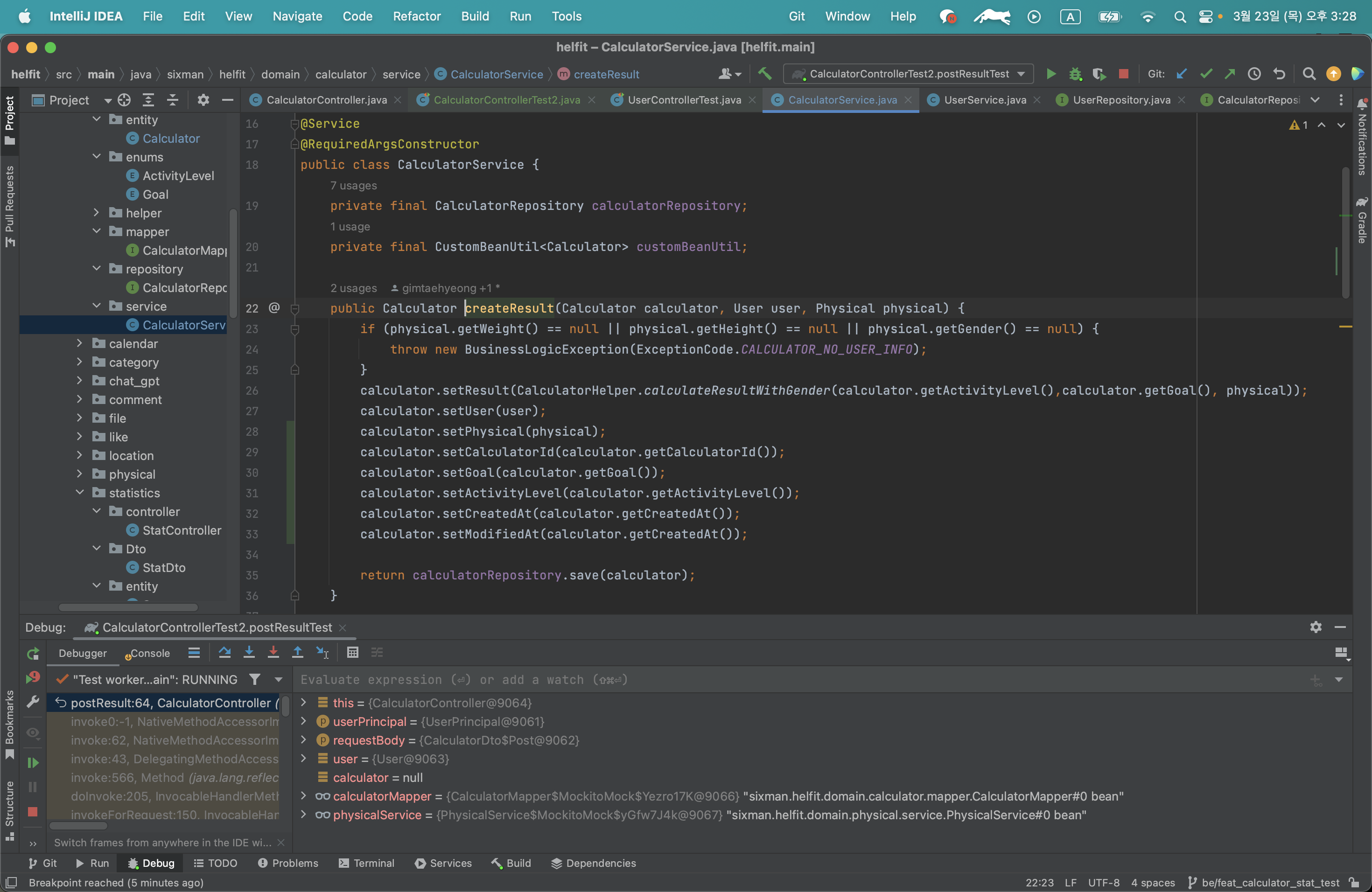 3) 코드에서는 기본적으로 given으로 createResult와 findPhysicalByUserId 만을 테스트했고, 4)에서 수정한것은 calculatorPostToCalculator과 calculatorToResponse를 given으로 테스트 했다. 그리고 또 자랑할만한 것은 3)에서 physical과 calculator를 일일이 setup 해주었지만, 저 객체들은 postResult에서만 사용되는 객체가 아니기 때문에 따로 setup으로 빼줬다.