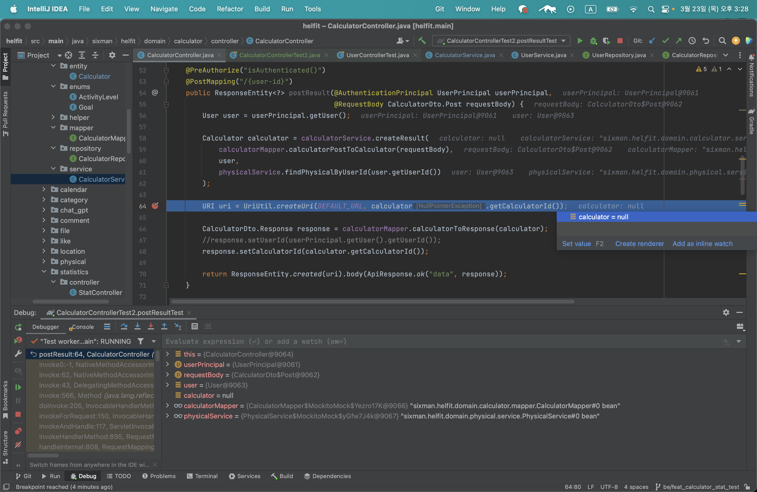 디버깅 결과 calculator가 자꾸 null이 나온다!