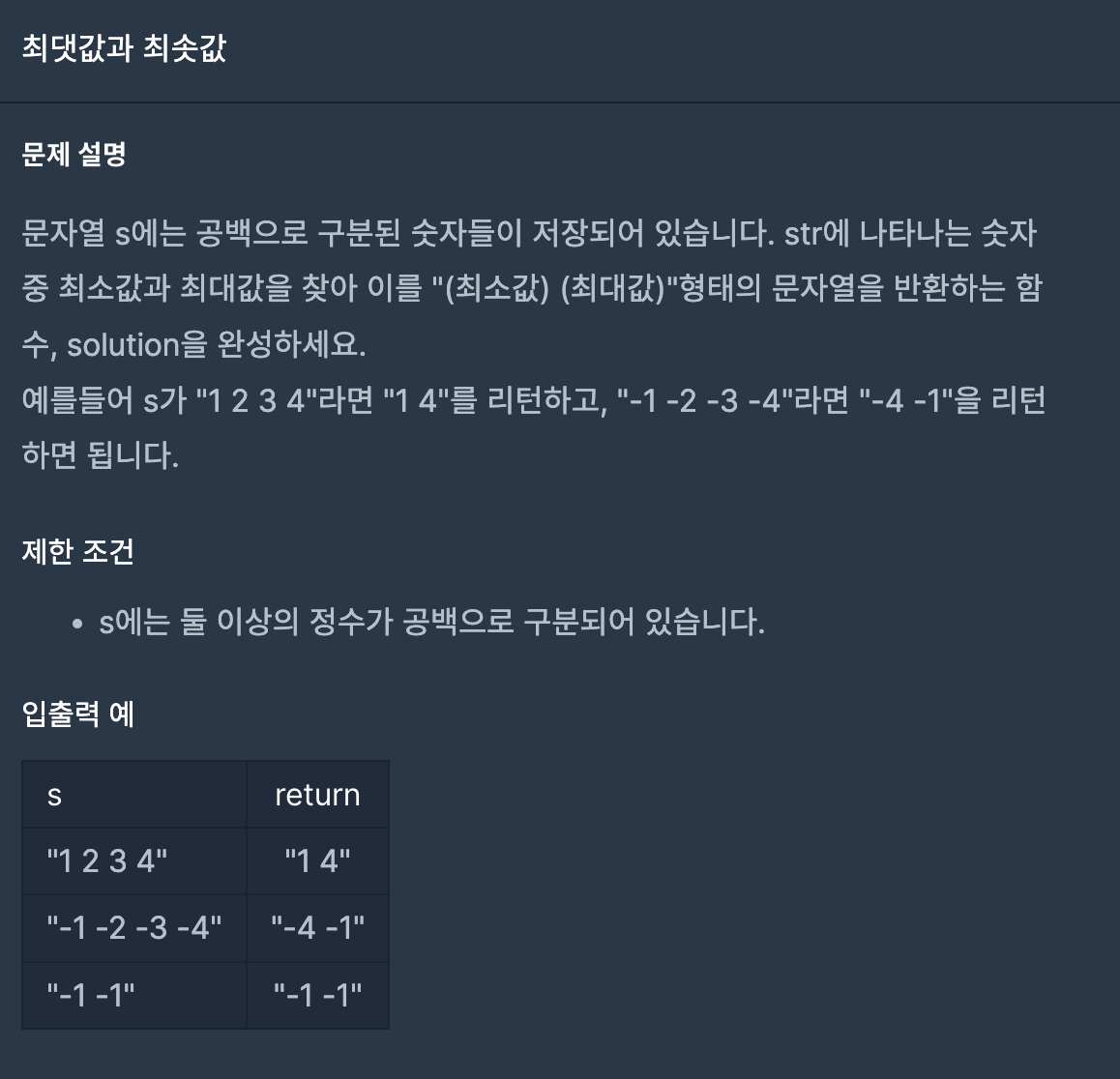 문자열을 split으로 나누고, 배열의 최댓값 최솟값을 return하면 되겠네 했는데 무슨일인지