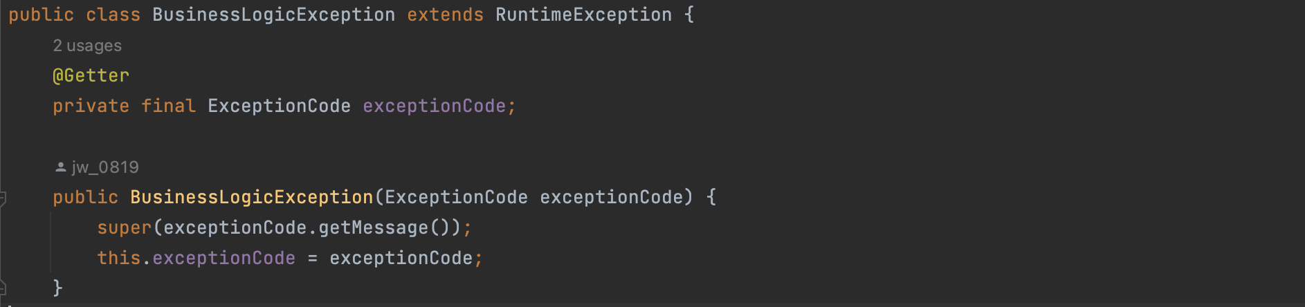 두번째 BusinessLogicException클래스는 RuntimeException클래스를 상속한다.