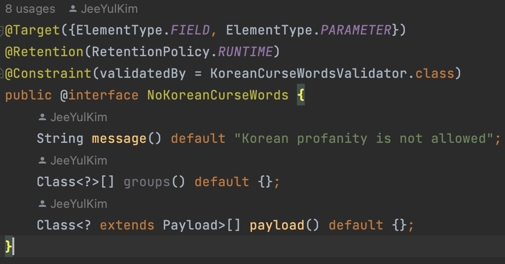 한글 욕을 필터링하는 애너테이션이다. 대충 이런느낌이다.