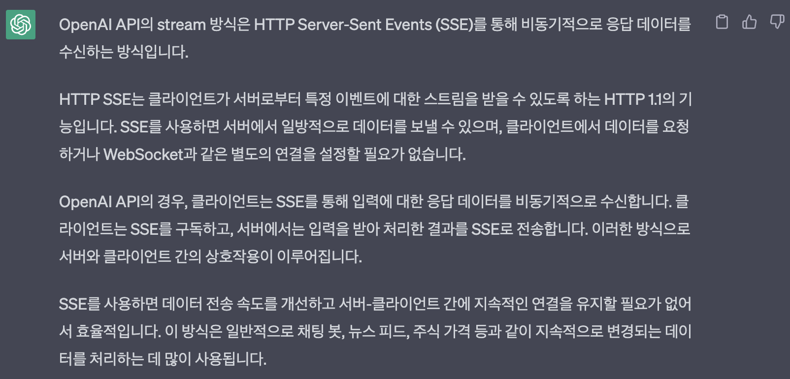 인자로 받은 question 값을 질문으로 간주해, ChatGptConfig에서 설정된 URL, 모델, 파라미터들을 이용하여 WebClient를 사용하여 요청을 보낸다.해당 요청은 Event Stream을 이용하여 응답을 받으며, 받은 응답을 Flux 형태로 리턴함. 받은 Flux는 ServerSentEvent 형태로 변환하여 전달한다.