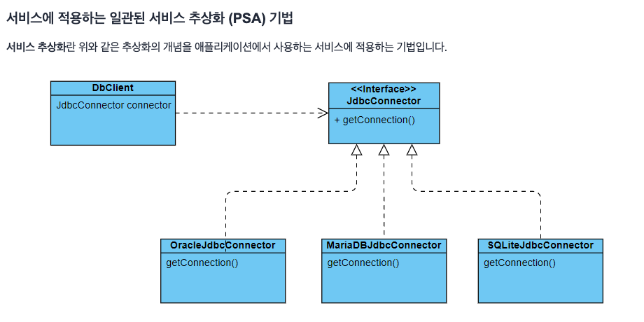 클라이언트가 추상화된 상위 클래스를 일관되게 바라보며 하위 클래스의 기능을 사용하는 것이 일관된 서비스 추상화의 기본 개념.