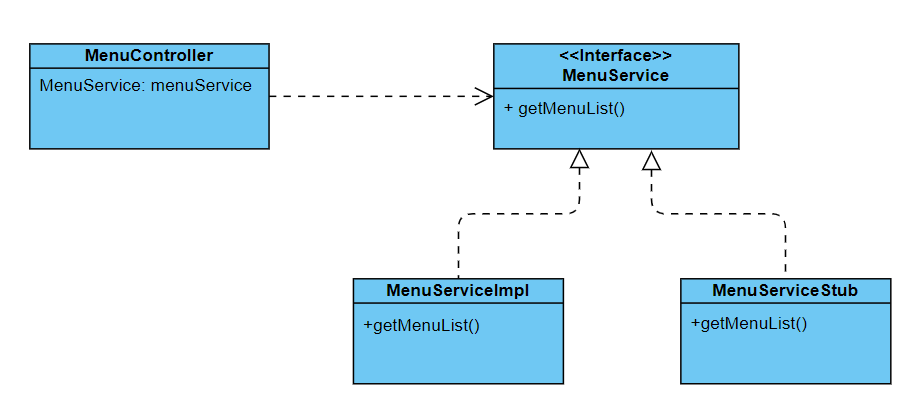 스텁데이터가 필요하면 MenuServiceStub을 사용하고, 실제 서비스를 할땐 MenuServiceImpl을 사용하는 방법으로 느슨한 결합이 된다. 이렇게 되면 new 를 쓸 필요없이 spring에서 제공하는 기능들로만 느슨한 결합을 만들 수 있다.
