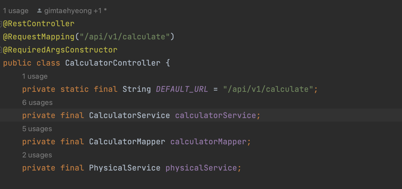 내가 짠 코드의 일부다. CalculatorController위에 @RequiredArgsConstructor 을 사용해, 생성자를 자동으로 만들어주고, CalculatorService, CalculatorMapper, PhysicalService의 객체를 만들어줌으로 써 DI를 한것이다.