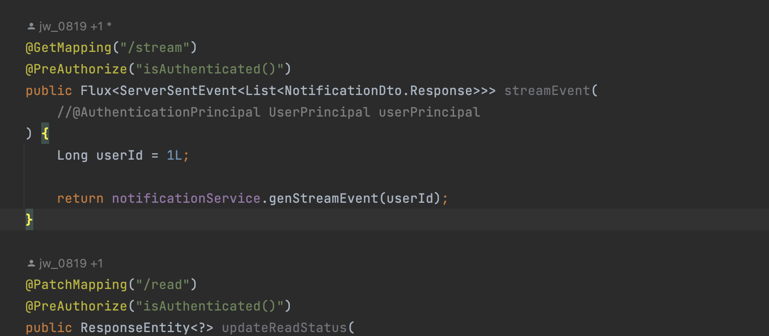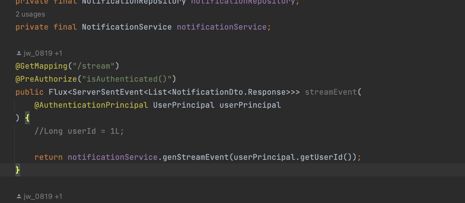 @PreAuthorize("isAuthenticated()") 애너테이션과 token에 해당하는 user를 사용하기 때문에 파라미터로 @AuthenticationPrincipal UserPrincipal userPrincipal 를 받는걸 볼 수 있다. 이렇게 하면 UserService에서 사용되는 파라미터를 충족시킬 수 있다.