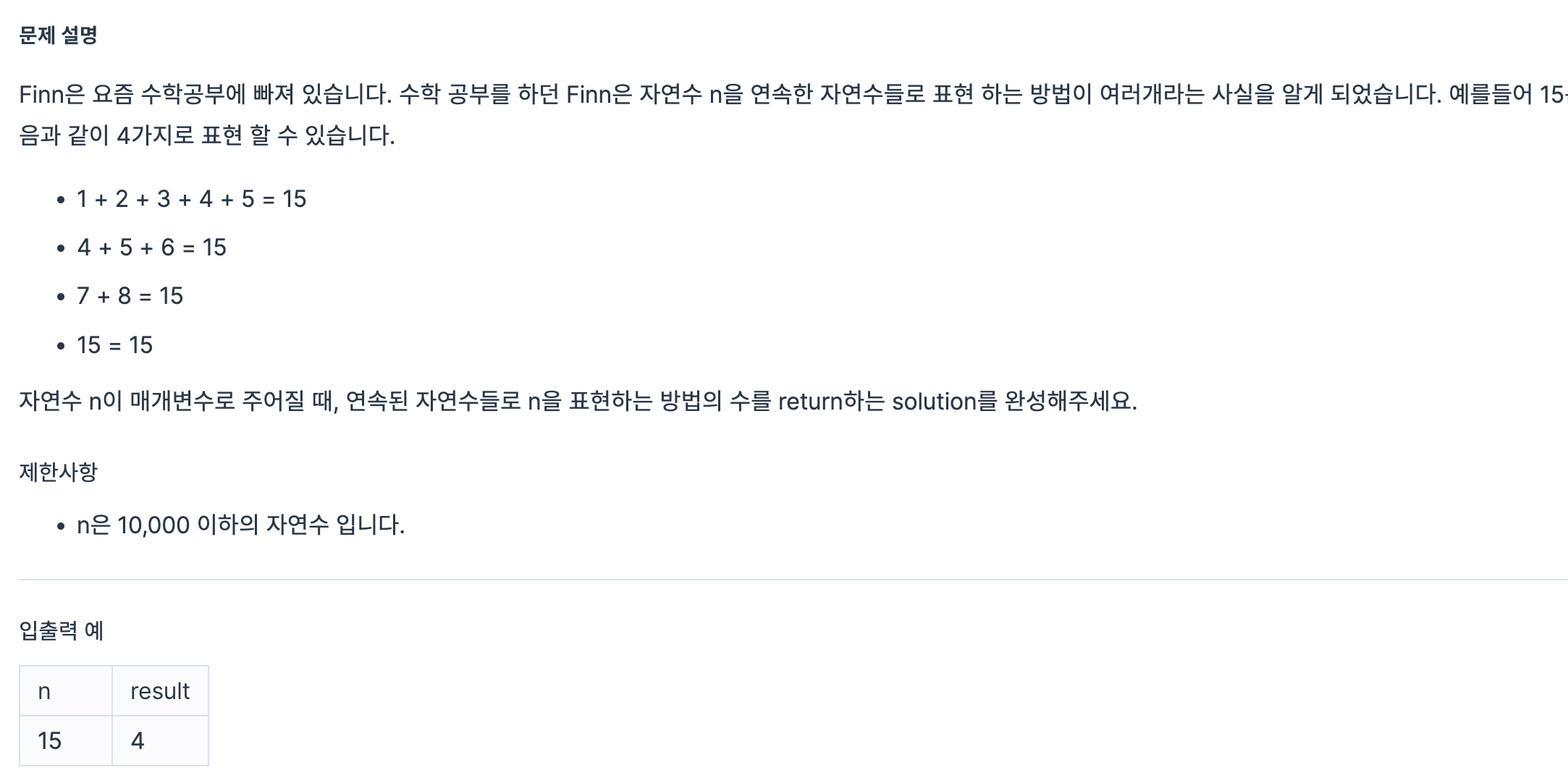 첫번째 반복문으로 i는 1부터 n까지 반복하고 두번째반복문으로 i를 n까지 반복. sum은 n이랑같으면 경우의수(answer)++ 한다. 다르면 탈출.