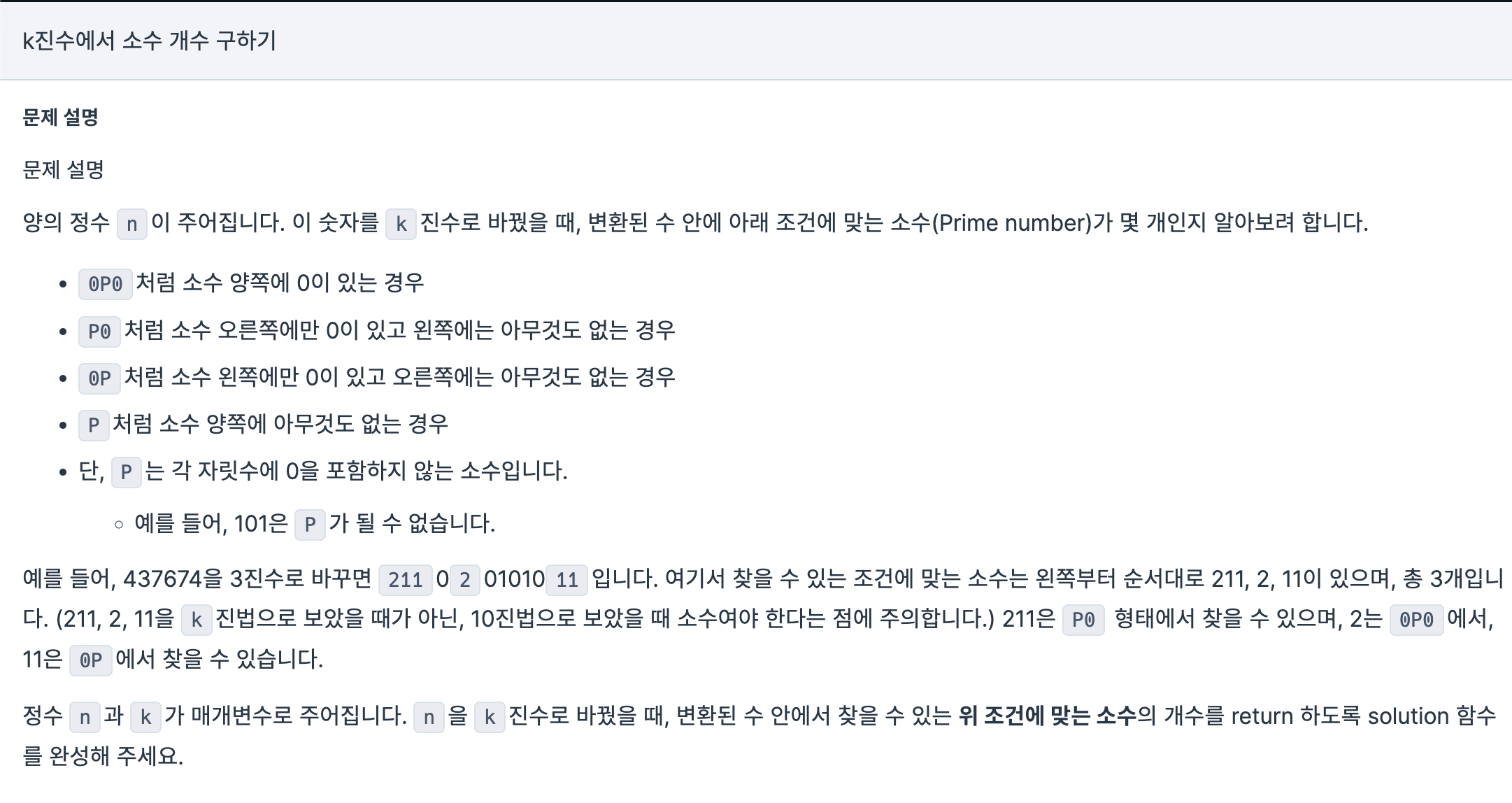 문제는 생각보다 쉬웠다. 완전탐색으로 풀수도있지만 조건을 잘 보면, 그냥 0으로 스플릿해서 스플릿된걸 소수인지아닌지만 판별하면 되는거였다. 그래서 1트에 어떻게 풀었는지 설명을 해보겠다.