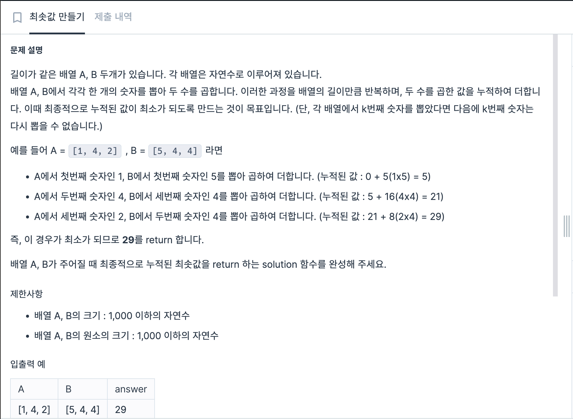 A와 B의 원소를 하나씩 뽑아 곱하고 더한값중 최솟값이 되는 경우를 찾는것이다.