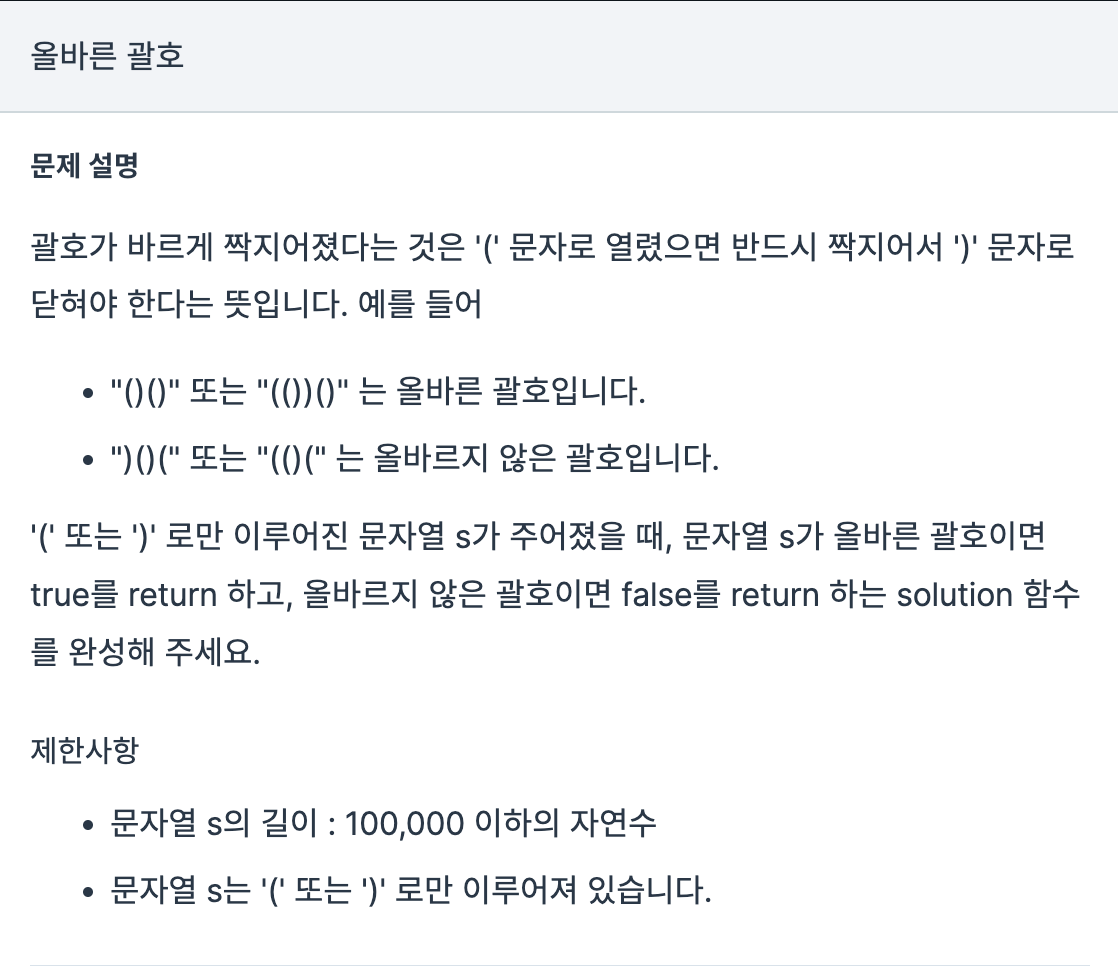 // 문자열을 모두 처리했는데 스택에 여전히 '(' 문자가 남아있다면 올바른 괄호 문자열이 아닙니다.