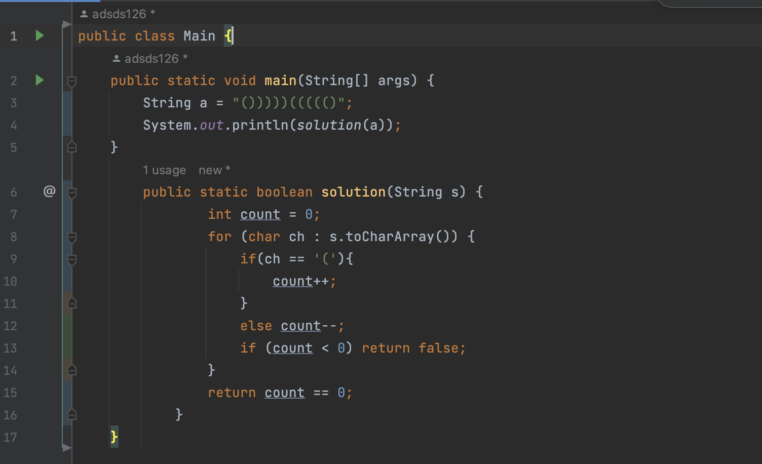 입력받은 String s 를 한글자씩 char로 배열을 만들고, 향상된 for문을 이용해 '('를 넣으면 count 1추가, ')'이면 1빼기 해서 결국 괄호의 짝이 맞으면 count는 0이 되고, 0이 아닌경우(괄호가 짝이 안맞거나, 여는괄호 닫는괄호 갯수가 다르면), false가 된다.