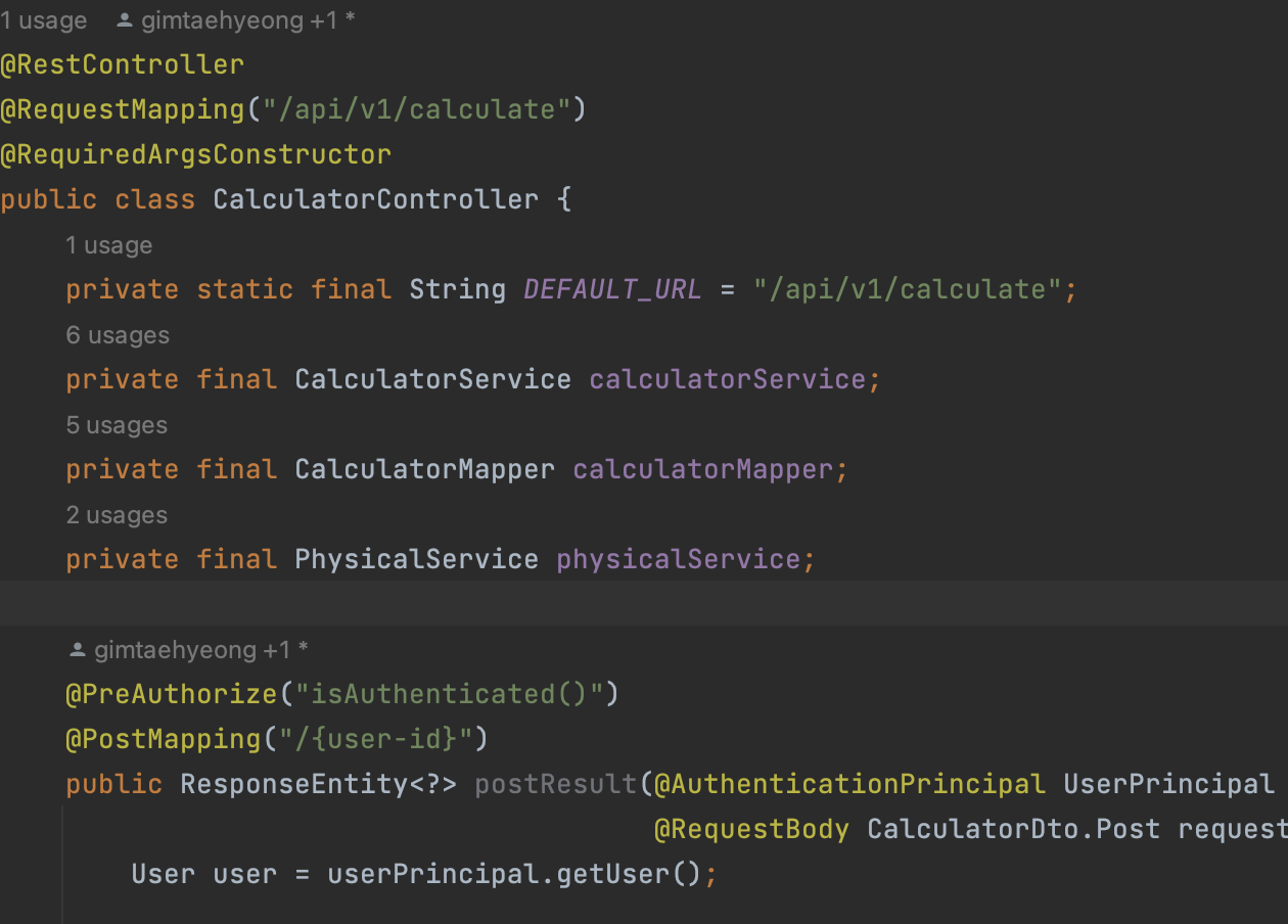 내가 만든 컨트롤러의 모습이다. 노란색은 전부 애너테이션이다.