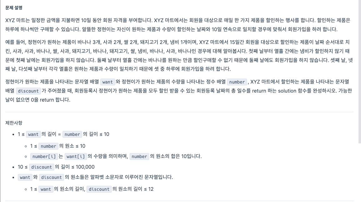 public static int solution(String[] want, int[] number, String[] discount) {